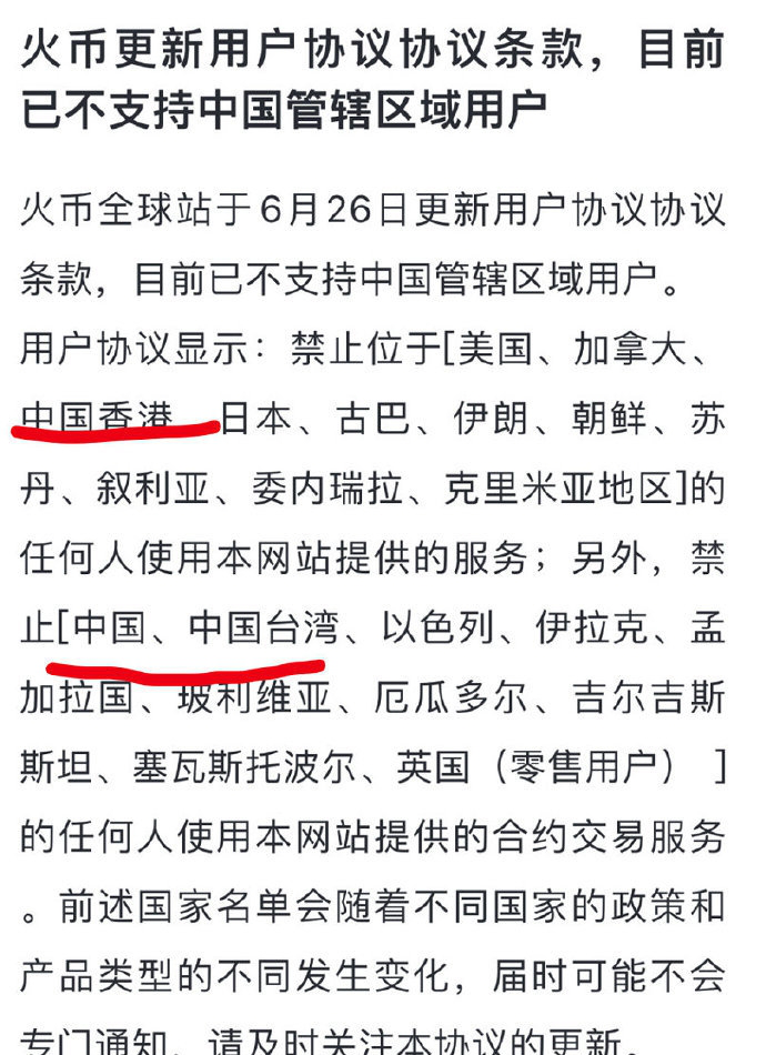 6月26日,火币也发布新规则,目前已不支持中国管辖区域用户。禁止位于中国香港的任何人使用网站提供的服务,禁止中国、中国台湾的任何人使用网站提供的合约交易服务。