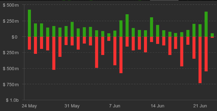 6 月 22 日清算的多头头寸不到 6 亿美元,低于前一天的 7.5 亿美元。如果多头被过度杠杆化,在不到两天的时间内下跌 20% 就会触发更大规模的止损单。